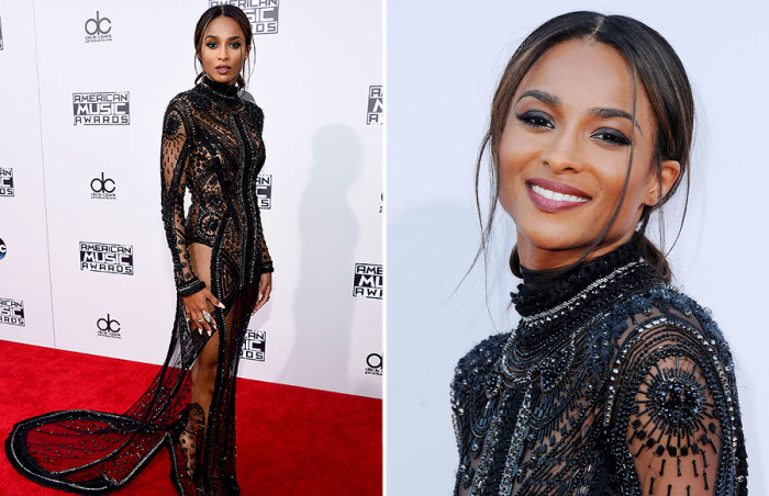 Еще одно черное прозрачное платье на американской певице Сиаре выглядело очень роскошно. Оно было расшито бисером, а шлейф придавал наряду особую элегантность.