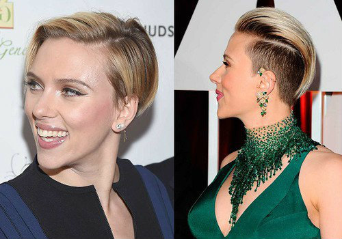 Молодая актриса не пыталась экспериментировать с цветом волос. А вот насчет длины – никак не может остановиться. Еще в 2014 году свои пышные длинные волосы она поменяла на короткую стрижку, а в этом году и того больше – ее голову украшают чуть ли не выбритые волосы, которые подчеркивают своеобразный «ирокез». А вышла в свет Скарлетт с этой прической первый раз на церемонии «Оскар» - 2015.